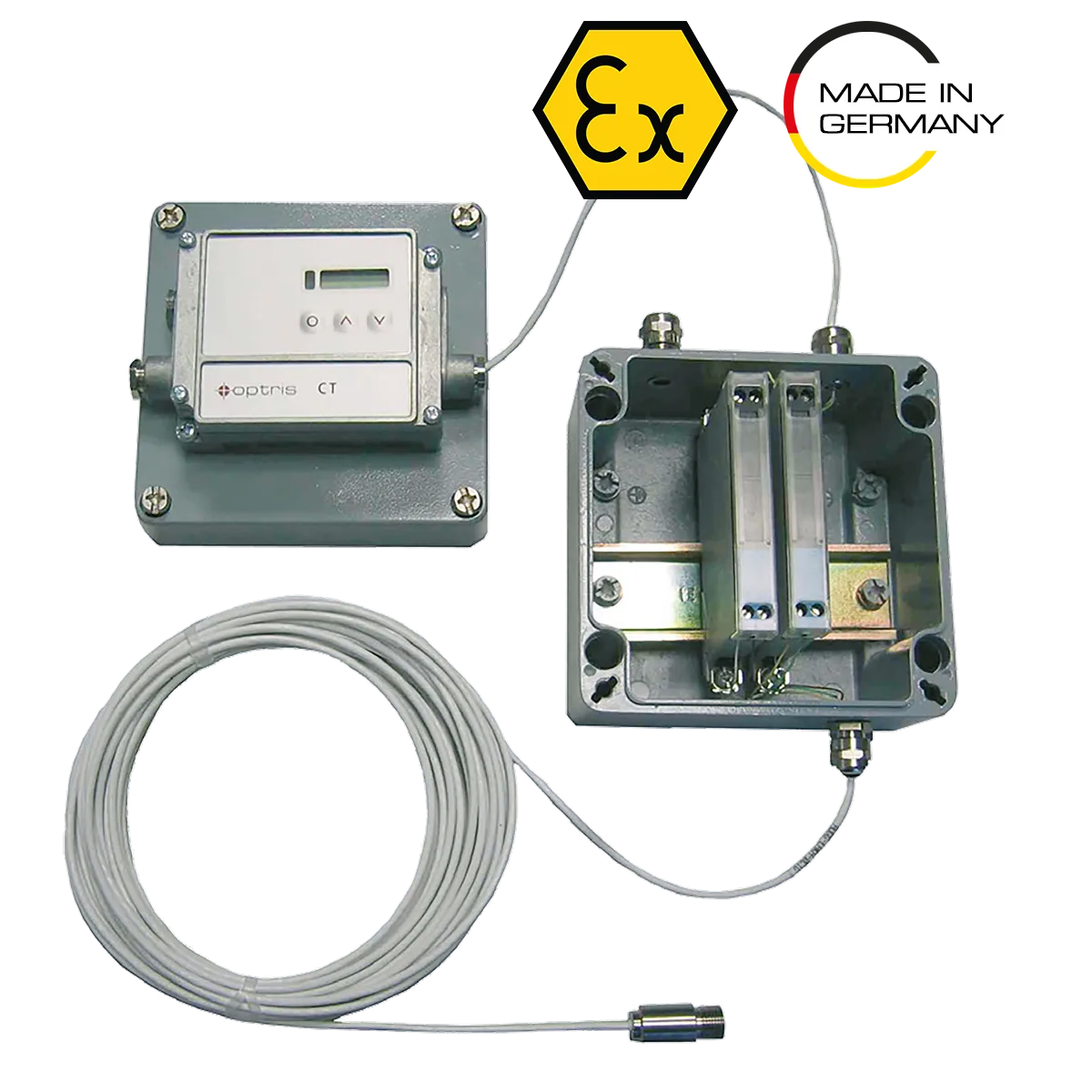 Le système de mesure pyro ATEX CTex d’Optris est spécialement conçu pour les applications en zones explosives. Ce système deux pièces se compose d’une électronique active pour l’évaluation et d’un récepteur infrarouge passif (tête de détection), permettant une installation sécurisée en zones dangereuses.